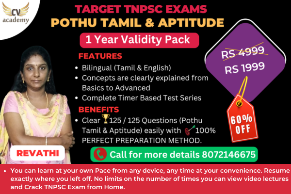 TNPSC Pothu Tamil & Aptitude Full Course is very important for aspirants appearing for TNPSC Group I, TNPSC Group II/IIa, TNPSC Group IV & VAO Exams as it includes entire General Tamil Courses, Aptitude and Mental Ability Course, Chapter wise Tests and Subject wise Tests. You can learn at your own Pace from any device (Mobile, Tablet, PC, Laptop, Smart TV etc), any time at your convenience. Resume exactly where you left off. No limits on the number of times you can view video lectures and Crack TNPSC Exam from Home.