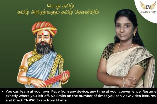 பொது தமிழ் - தமிழ் அறிஞர்களும் தமிழ் தொண்டும் Course is very important for aspirants appearing for TNPSC Group I, TNPSC Group II/IIa, TNPSC Group IV & VAO Exams as it comes under General Tamil Section. You can learn at your own Pace from any device (Mobile, Tablet, PC, Laptop, Smart TV etc), any time at your convenience. Resume exactly where you left off. No limits on the number of times you can view video lectures and Crack TNPSC Exam from Home.